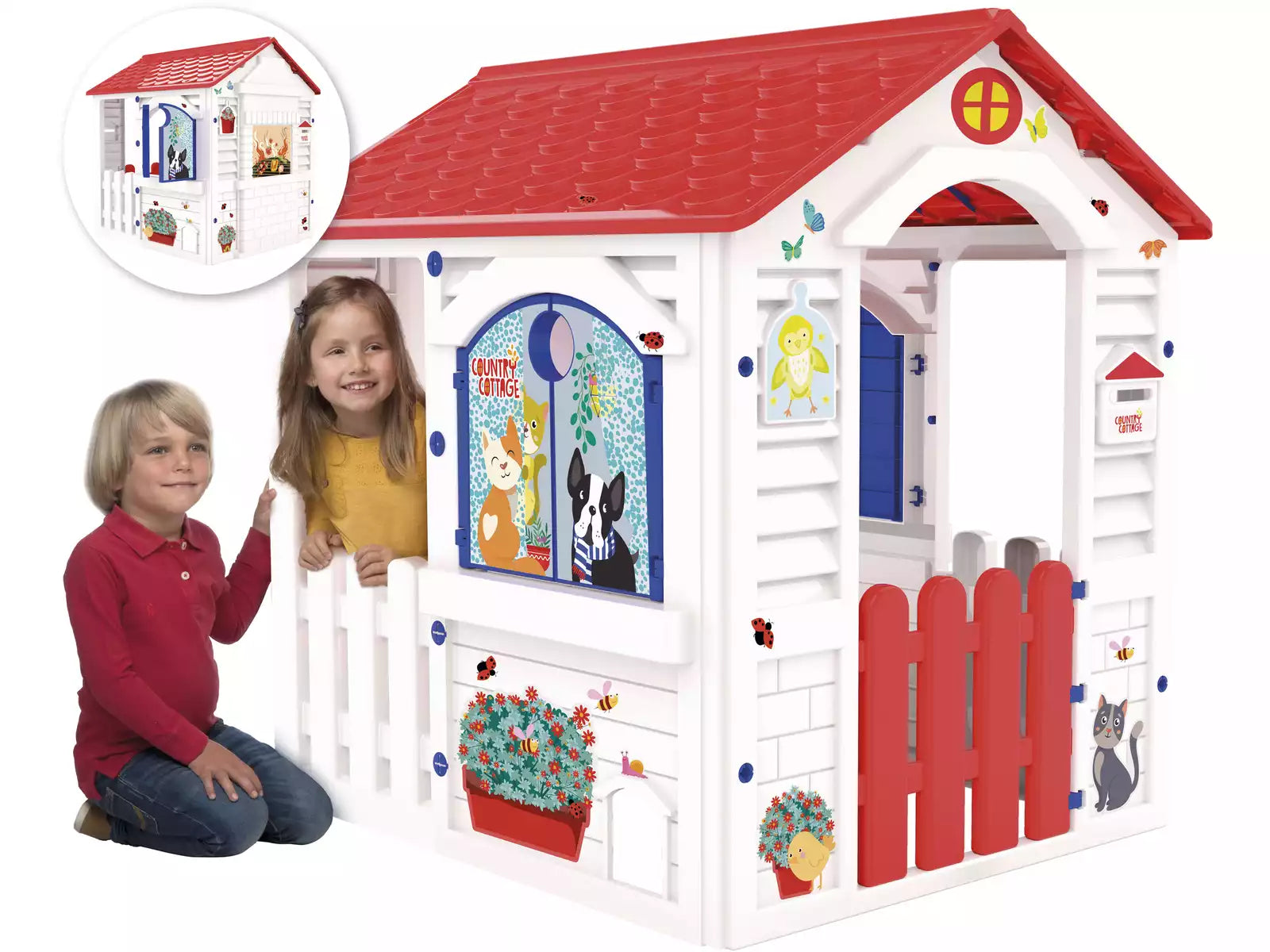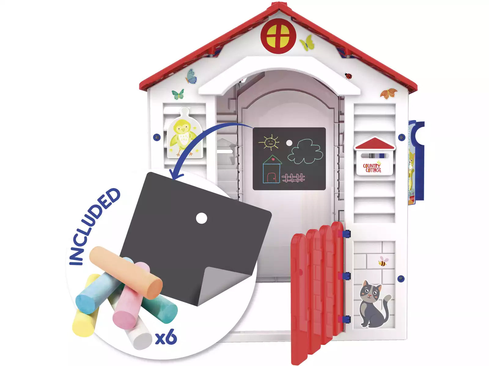 Include: 1 casa per bambini bianca e rossa con lavagna, barbecue posteriore, finestre pieghevoli, cassetta delle lettere, gattaiola per animali domestici, disegno speciale, 6 gessetti colorati e disegno di alta qualità.