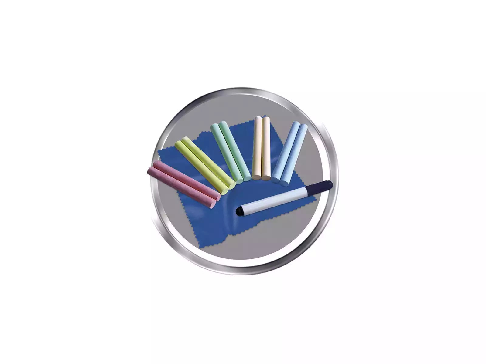 Include: 1 doppia lavagna, modello, panno, gesso e pennarello.