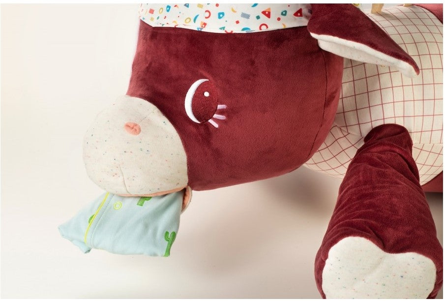 Rosalie la mucca guarda l’uccellino che si sistema su di lei. Il suo corpo contiene tante attività sorprendenti per i piccoli. Psst, la sua grande bocca può custodire il tuo pigiama o i tuoi più grandi segreti.