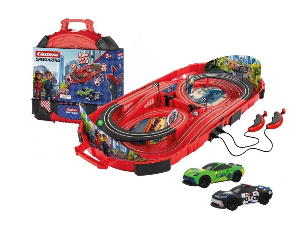Nella Carrera First Speed ??Arena, la velocità è tutto. In questo inseguimento con la polizia, la polizia insegue la macchina superveloce Green Flash. La domanda, ovviamente, è chi è il più veloce? La Speed ??Arena è perfetta da portare ovunque, così puoi gareggiare in ogni luogo. Quando la richiudi, la tua pista da corsa diventa una valigia facile da trasportare. La Speed ??Arena funziona con 4 batterie AA (non incluse).