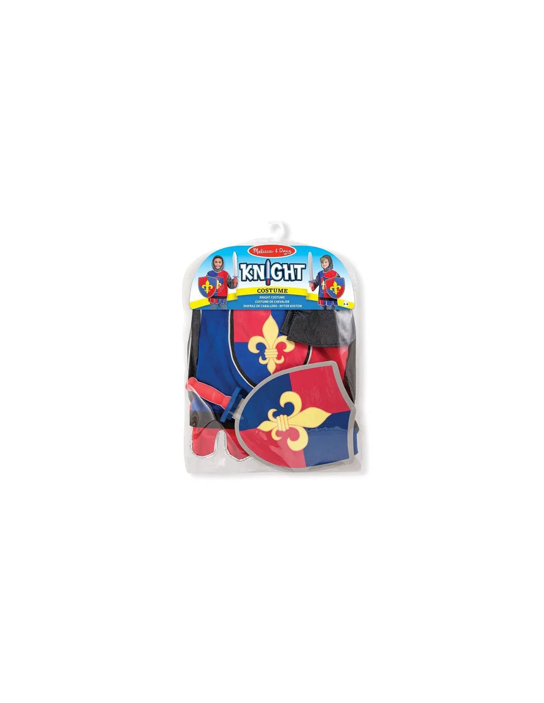 Set travestimento Cavaliere con casacca, spada e scudo in morbida spugna e cappuccio in maglia. Ideale per feste a tema o per Carnevale.
