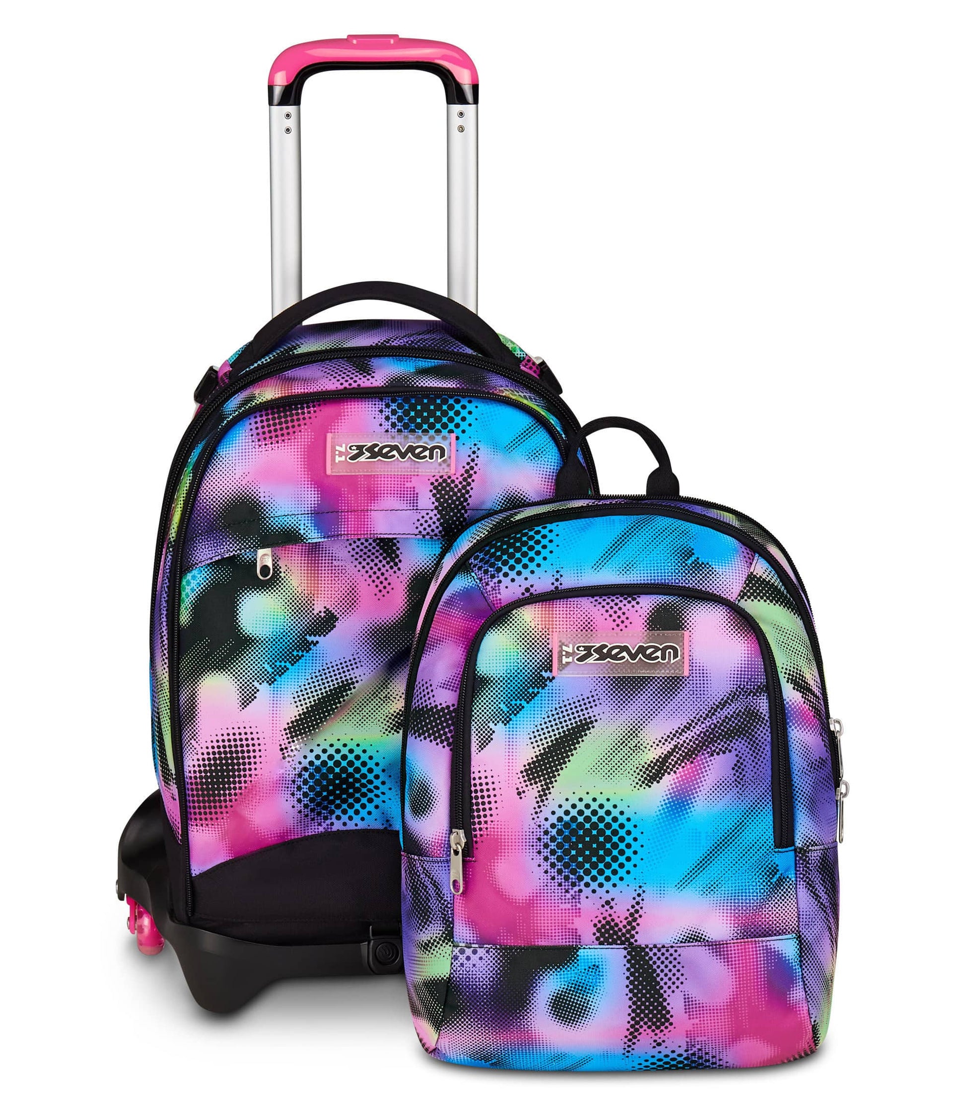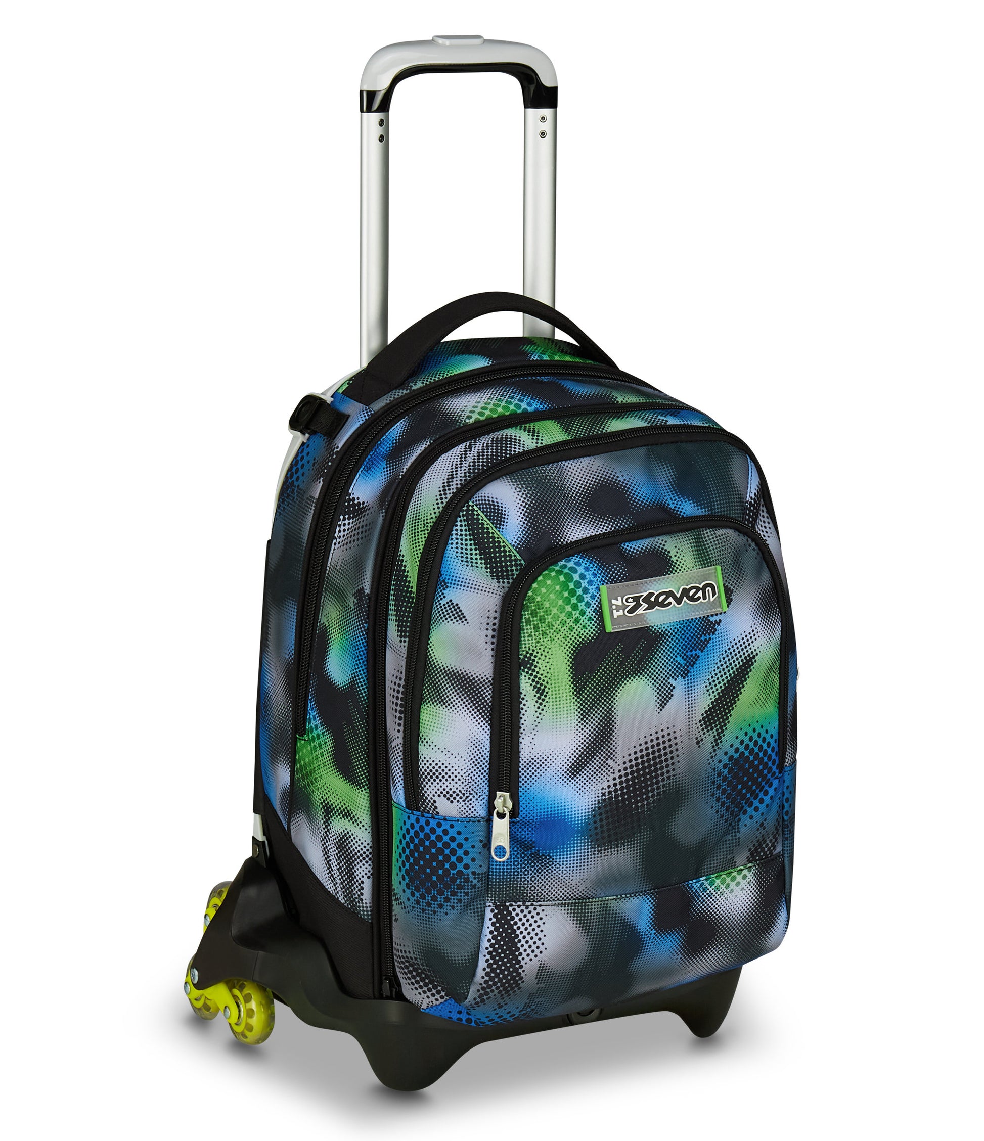 Trolley scomponibile con sistema a tre ruote. Maxi barra, Crossover System con clips per l'aggancio dei nastri, doppia barra telescopica con due regolazioni in altezza, fondo rinforzato e protezioni angolari. 3 possibili utilizzi: 1) uso trolley con spallacci a scomparsa totale nello schienale; 2) uso zaino senza sganciare il carrello; 3) uso zaino quando completamente sganciato dal carrello.