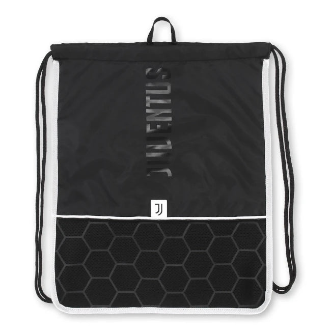 JUVE SACCA SPORT E/O TEMPO LIBERO, APERTURA CON COULISSE, CORDINI IN TINTA. SERIGRAFIA SU RETE IMBOTTITA, PATCH LOGO 'ICON' IN GOMMA BUCATO. LETTERING 'JUVENTUS' SERIGRAFATA LUCIDA TONO SU TONO.