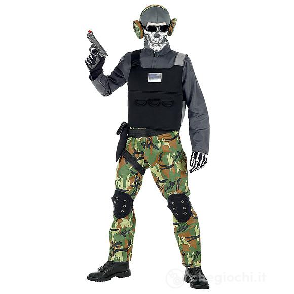 SOLDATO SCHELETRO (tuta, gilet, ginocchiere, cintura, fondina, maschera, occhiali, cuffie) 158 cm / 11-13 anni