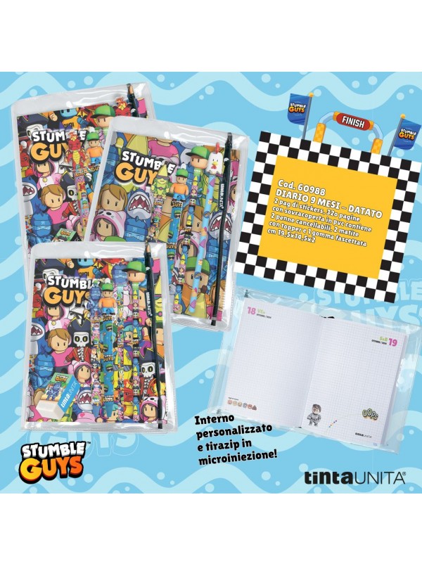 Diario con sovracoperta in PVC contenente 2 penne cancellabili + 2 matite con topper stamble guys + gomma e custodia con cerniera + 2 pagine di stickers